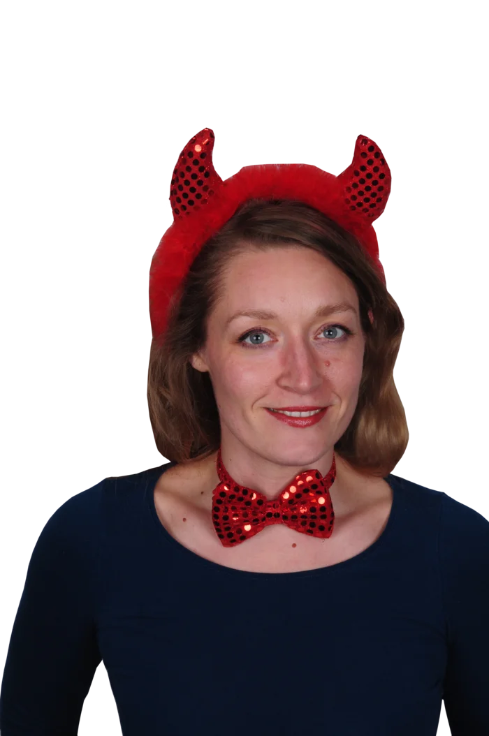 Sandy, importateur gadget vous suggére ce set de diablesse, top des ventes dans les boutiques de déguisements. Composé d’un diadème en cornes de diable et d’un tour de cou en forme de noeud papillon, ce set retient l’attention et suscite l’achat d’impulsion.
