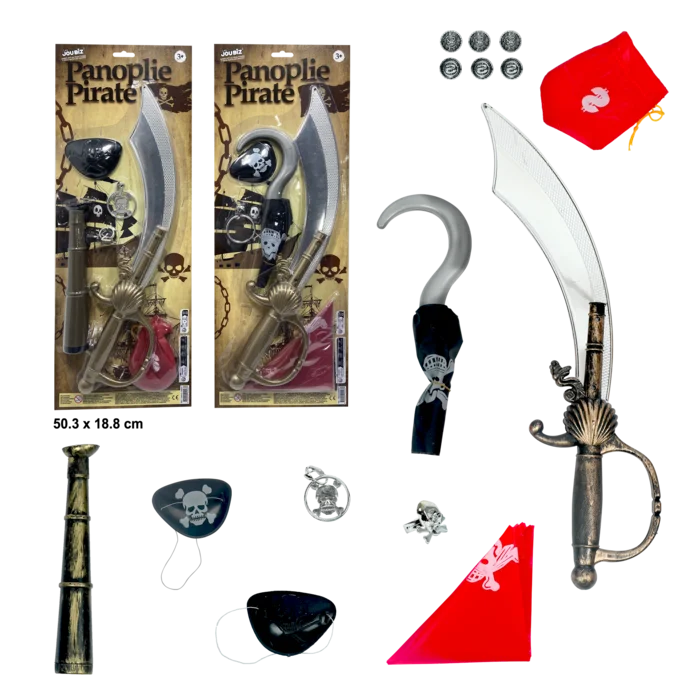 Ce set pirate fait fureur en boutiques de parc d’attraction à thème ou en gros lot de fêtes foraines. Disponibles en deux assortiments, ces parures sont composées de nombreux accessoires… Foncez, ce cadeau a tout pour plaire et fait rêver les petits corsaires !